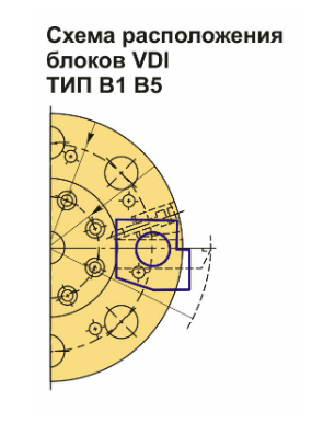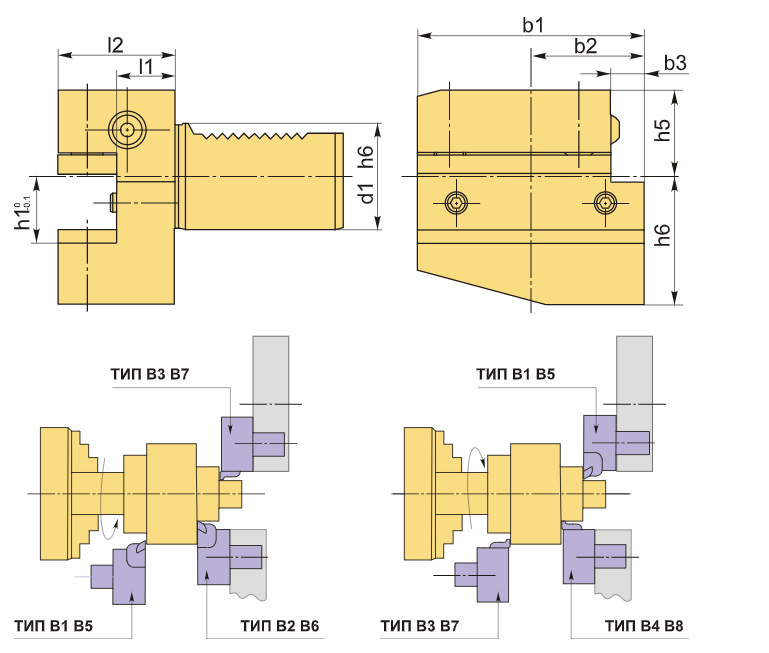 Инструментальный блок VDI30 типа B1 подходит для резцов с прямоугольным сечением. Данный тип оправок используется для наружной продольной и торцевой обработки. Резец устанавливается с пластиной вверх, а опорная поверхность располагается ниже оси центров.