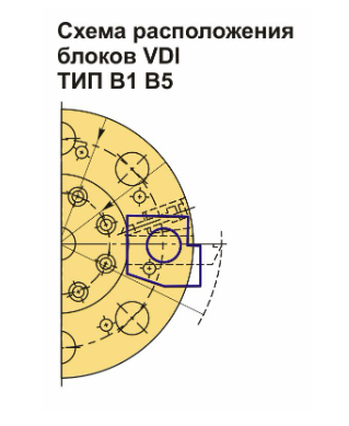 Инструментальный блок VDI40 типа B1 разработан для установки резцов с прямоугольным сечением. Он применяется для наружного продольного обработки и торцевого точения. Резцы монтируются с пластиной вверх, что обеспечивает их стабильное положение, так как опорная поверхность резца находится ниже оси центров.