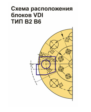 Инструментальный блок VDI30 типа B2 предназначен для резцов с прямоугольным сечением. Этот блок для наружных державок (оправок VDI) применяется в процессе наружной продольной и торцевой обработки. Резец устанавливается так, что его поверхность находится выше, а опорная площадка — ниже оси центров.