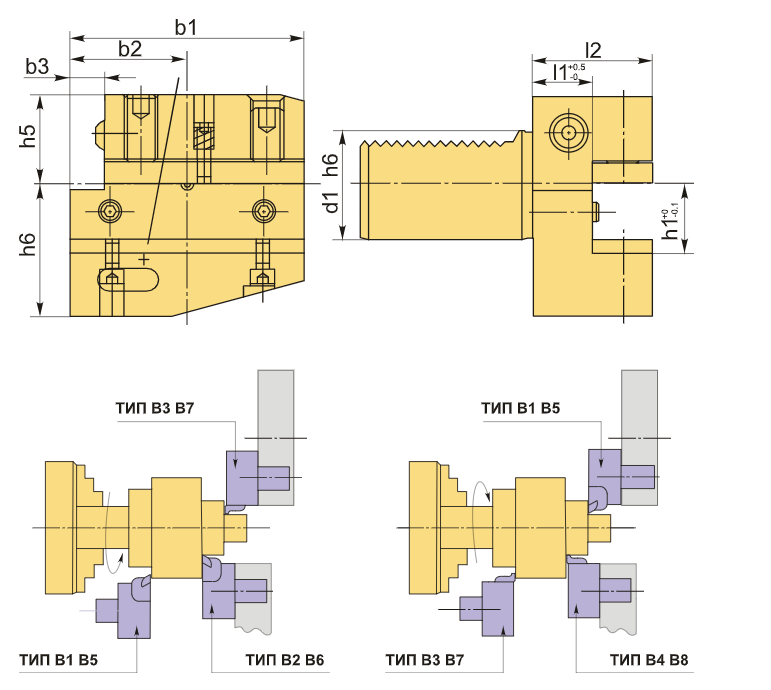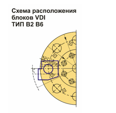 Инструментальный блок VDI50 типа B2 предназначен для резцов с прямоугольным сечением. Данный тип оправок используется для наружной продольной обработки и торцевого точения. Резец устанавливается пластиной вверх, при этом опорная поверхность располагается ниже оси центров.