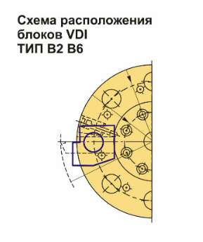 Инструментальный блок VDI60 типа B2 предназначен для резцов с прямоугольным сечением. Этот блок используется совместно с наружной державкой (оправками VDI) для выполнения наружной продольной обработки и торцевого точения. Резец устанавливается с пластиной в верхнем положении, а опорная поверхность инструмента размещается ниже оси центров.