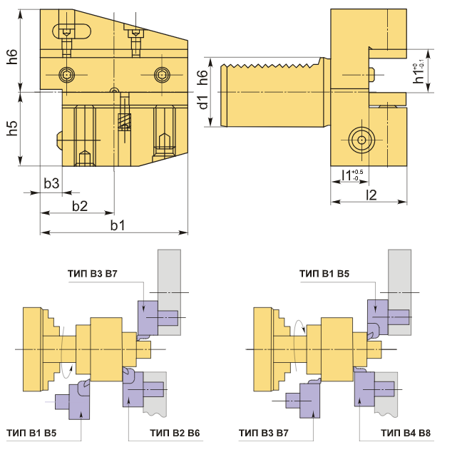 Инструментальный блок VDI30 типа B4 предназначен для резцов с прямоугольным сечением. Этот тип оправок используется для наружной продольной обработки и торцевого точения. Установка резца выполняется с пластиной обращенной вниз, при этом опорная поверхность резца находится выше оси центров.