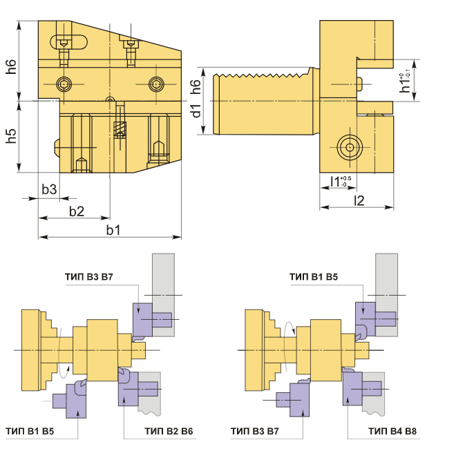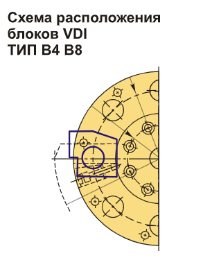Инструментальный блок VDI50 типа B4 предназначен для резцов с прямоугольным сечением. Данный тип оправок VDI применяется в наружной продольной обработке и торцевом точении. Резец устанавливается с пластиной вниз, а опорная поверхность располагается выше оси центров.