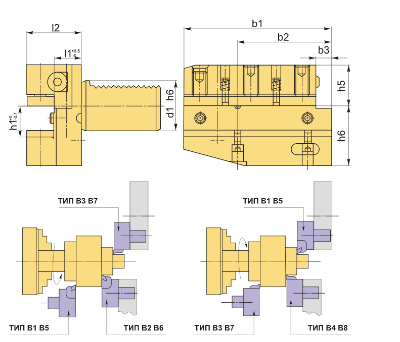 Инструментальный блок VDI40 типа B5 предназначен для резцов с прямоугольным сечением. Он используется для наружной продольной обработки и торцевого точения. Резец монтируется с пластины вверх, и его опорная поверхность располагается ниже оси центров.