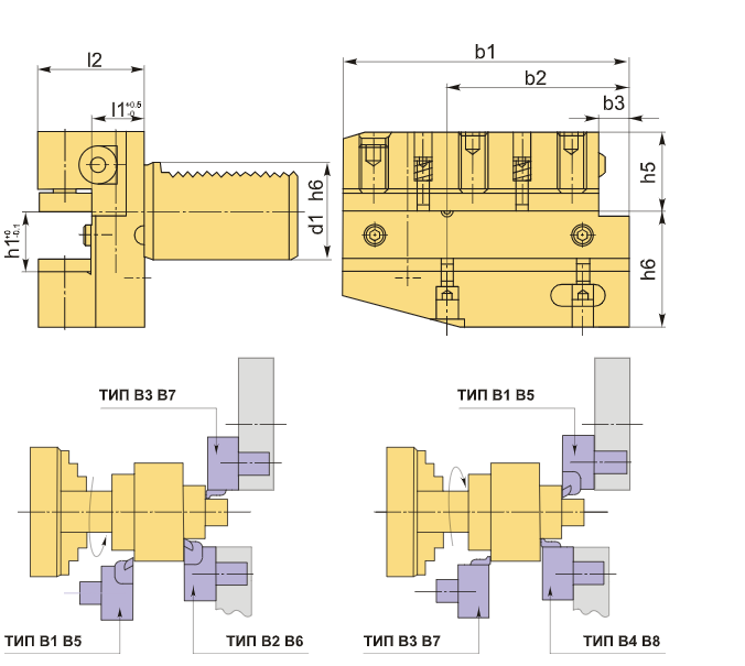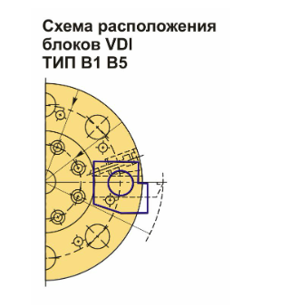 Блок VDI60 типа B5 предназначен для резцов с прямоугольным сечением. Данный тип оправок VDI идеально подходит для наружной продольной обработки и торцевого точения. Резец устанавливается так, чтобы его плоскость была направлена вверх, а опорная поверхность располагается ниже оси центров.