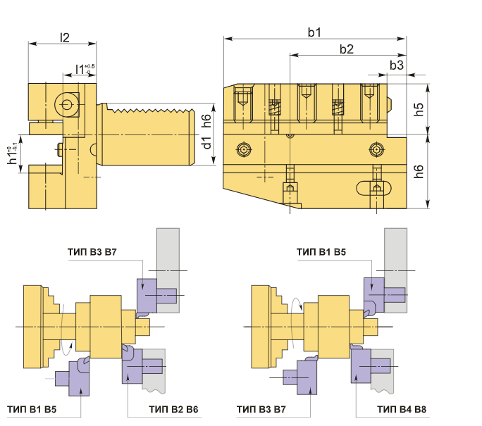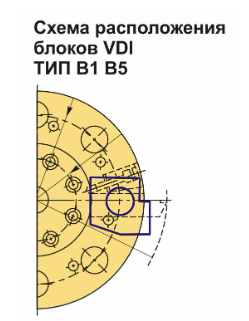 Инструментальный блок VDI50 типа B5 предназначен для резцов с прямоугольным сечением. Эти оправки VDI применяются для наружной продольной обработки и торцевого точения. Резцы устанавливаются пластиной вверх, при этом опорная поверхность находится ниже оси центров.