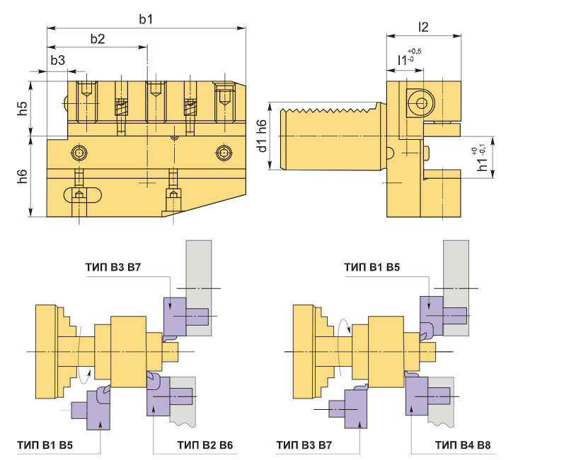 Инструментальный блок VDI30 типа B6 предназначен для резцов с прямоугольным сечением. Этот вид оправок VDI используется для выполнения наружной продольной и торцевой обработки. Резец устанавливается с пластиной вверх, а опорная поверхность находится ниже оси центров.