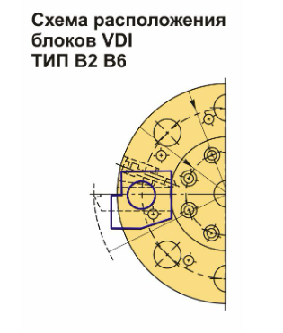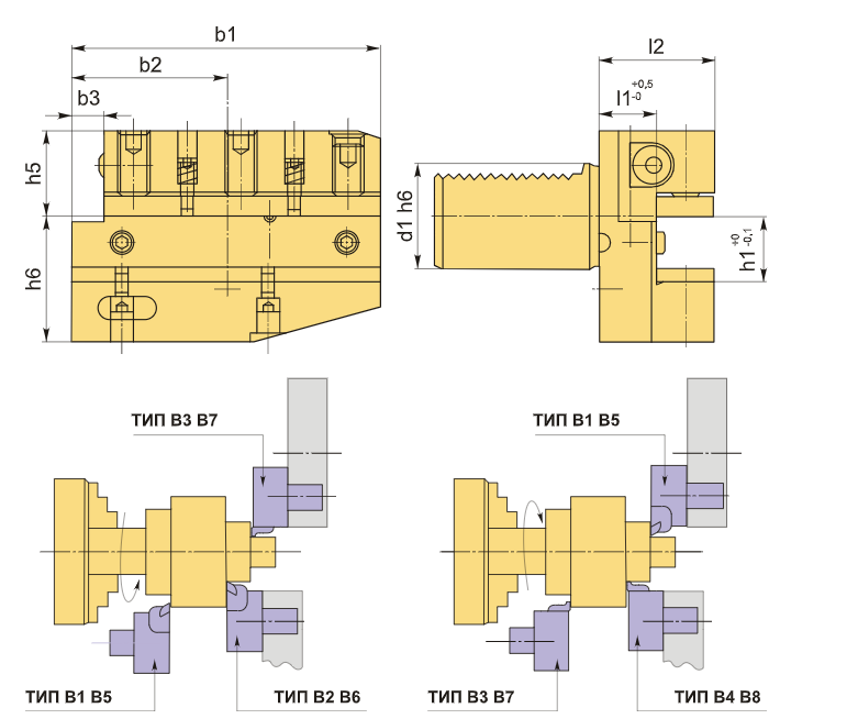 Инструментальный блок VDI60 типа B6 предназначен для резцов с прямоугольным сечением. Эти оправки используются в процессах наружной продольной обработки и торцевого точения. Резец монтируется с пластиной вверх, а опорная поверхность располагается ниже оси центров.