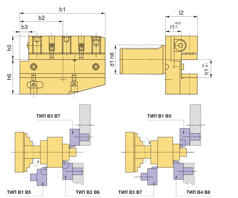 Резцедержатель VDI60 типа B6 имеет радиальную конструкцию, левостороннюю ориентацию и принадлежит к удлиненной серии. Основная опорная поверхность расположена ниже оси центров (оси вращения шпинделя), что делает его подходящим для радиального и продольного наружного точения. Держатель типа B6 аналогичен B2 по своему назначению и конструкции, но отличается большей длиной опорной и зажимной поверхности, что обеспечивает более высокую жесткость закрепления инструмента. Высота h1 составляет 32/25 мм (с проставкой 25 мм, без проставки 32 мм).