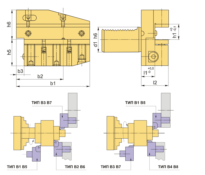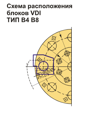 Инструментальный блок VDI30 типа B8 предназначен для резцов с прямоугольным сечением. Данный тип оправок VDI активно используется для наружной продольной обработки и торцевого точения. Резец устанавливается так, что пластина направлена вниз, а опорная поверхность находится выше оси центров.