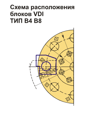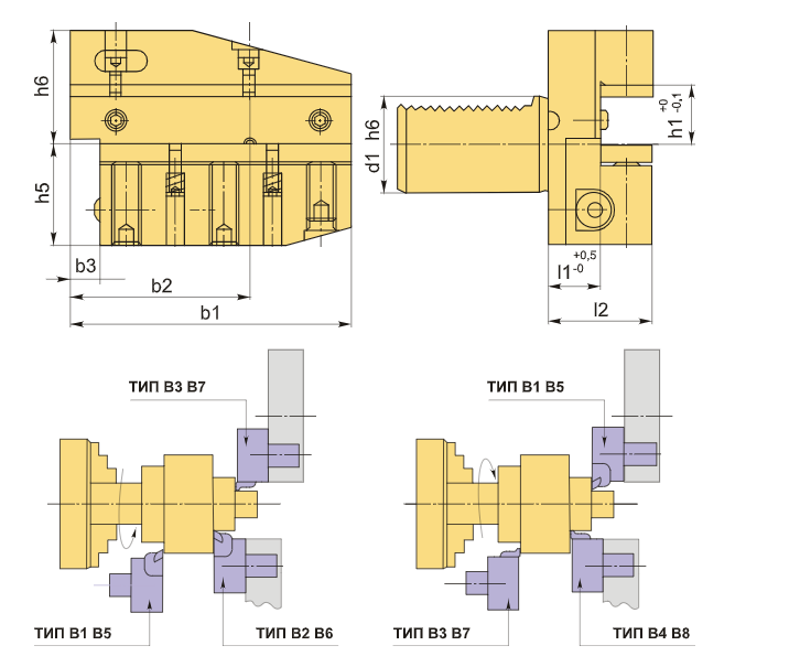 Инструментальный блок VDI60 типа B8 предназначен для использования с резцами прямоугольного сечения. Он подходит для наружной продольной обработки и торцевого точения. Установка резца осуществляется пластиной вниз, при этом опорная поверхность находится выше оси центров.