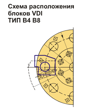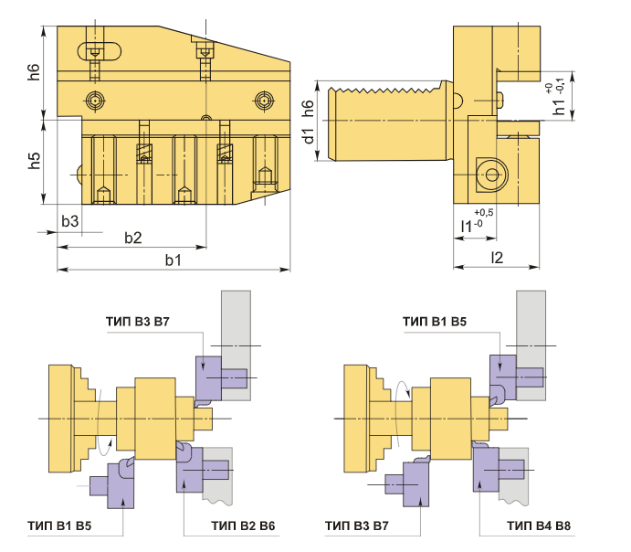 Инструментальный блок VDI60 типа B8 предназначен для резцов с прямоугольным сечением. Этот тип оправок VDI используется для наружной продольной и торцевой обработки. Резец устанавливается плоской стороной вниз, при этом опорная поверхность инструмента располагается выше оси центров.