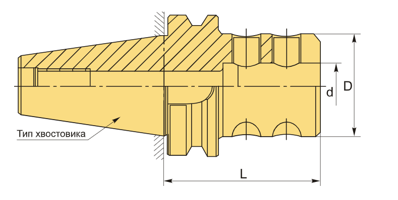 Конус по стандарту MAS403 (типоразмер BT40). Предназначен для зажима инструмента с цилиндрическим хвостовиком диаметром 25 мм, оснащённым продольной лыской — в соответствии со стандартами DIN 1835-B и DIN 6535-HB. Конструкция включает два зажимных винта с внутренним шестигранником, которые прижимаются к уступу на лыске, обеспечивая надёжную фиксацию и точное центрирование инструмента.