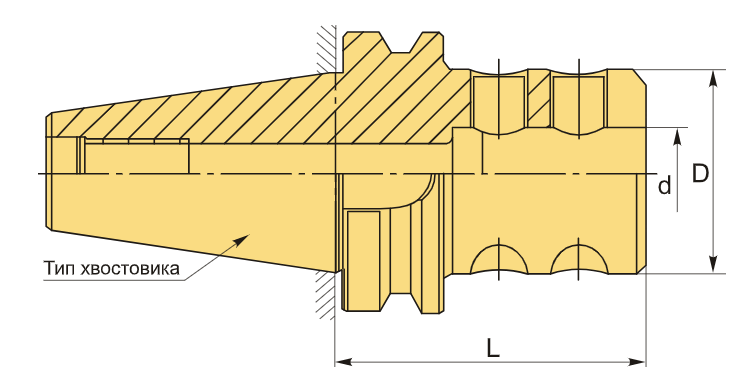 Конус по стандарту MAS403 (BT50), предназначена для зажима инструмента с цилиндрическим хвостовиком, оснащённым боковой лыской — в соответствии с DIN 1835-B и DIN 6535-HB. Внутренний диаметр зажимного отверстия — 25 мм. Конструкция включает два зажимных винта с шестигранным приводом, которые, упираясь в лыску инструмента, обеспечивают надёжную фиксацию и точное центрирование. Вылет от базовой поверхности шпинделя — 160 мм, радиальное биение не превышает 0,005 мм.
