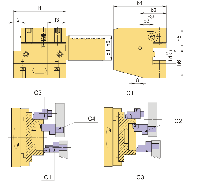 Аксиальный тип резцедержателей VDI предназначен для выполнения разнообразных операций наружной токарной обработки, включая цилиндрическую, коническую и контурную. Блоки VDI типа C особенно хорошо подходят для установки канавочных резцов, используемых для обработки канавок на торце деталей.