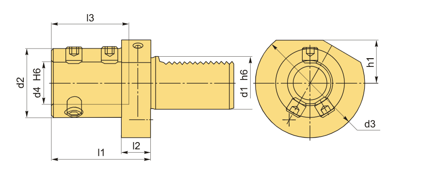 Держатель типа VDI E1 предназначен для фиксации инструмента с цилиндрическим хвостовиком диаметром 32 мм, соответствующим размеру хвостовика оправки VDI30. Главное предназначение блока VDI – это удержание корпусных сверл с U-образными сменными пластинами, однако он также подходит для фиксации другого осевого инструмента с хвостовиком по стандарту DIN 6595, где необходима внутренняя подача охлаждающей жидкости, а также при наличии лыски на хвостовике инструмента.