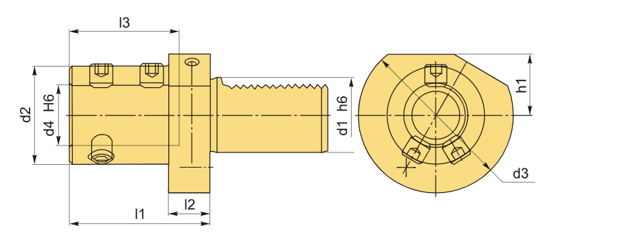 Держатель VDI типа E1 предназначен для крепления инструментов с цилиндрическим хвостовиком диаметром 25 мм. Он выполнен с размером хвостовика, соответствующим стандарту VDI40. Блок VDI чаще всего используется для установки корпусных сверл с U-образными сменными пластинами, но также подходит для фиксации другого осевого инструмента с хвостовиком по стандарту DIN 6595, где необходима внутренняя подача охлаждающей жидкости, а хвостовик инструмента должен иметь шлицы.