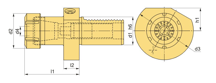 Держатель VDI типа E4 с цанговым патроном, предназначенный для установки цанг ER20 в соответствии со стандартом DIN 6499. Он обеспечивает диапазон зажима от 1 до 13 мм. Хвостовик этого устройства выполнен по размеру VDI40. Смазочно-охлаждающая жидкость подается внутрь через цангу.