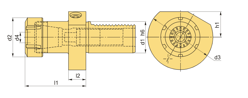 Держатель VDI типа E4 представляет собой цанговый патрон, предназначенный для фиксации цанг ER20 в соответствии со стандартом DIN 6499. Хвостовик оправки имеет размер VDI40. Подвод охлаждающей жидкости осуществляется через цангу.