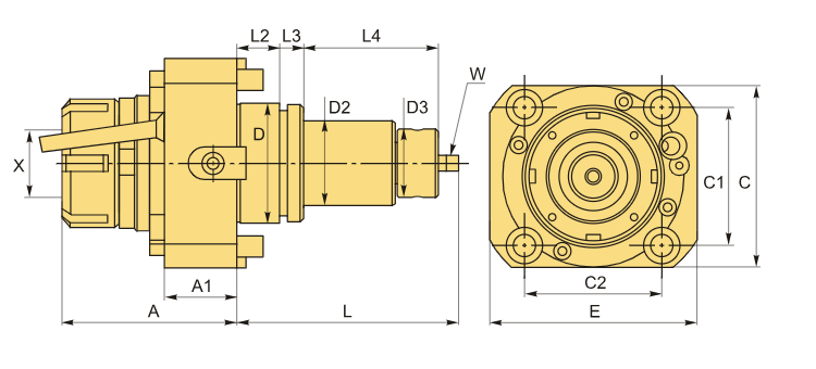 Для цанг ER25/ER25S согласно стандарту DIN 6499. Диапазон зажима: от 1 до 16 мм. Осуществляется внешнее охлаждение. Передаточное число составляет 1:1.