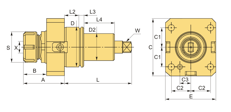 Для цанг ER32/ERS32, соответствующих DIN 6499. Зажимный диапазон составляет 2-10 мм. Передаточное число – 1:1. Охлаждение производится снаружи.