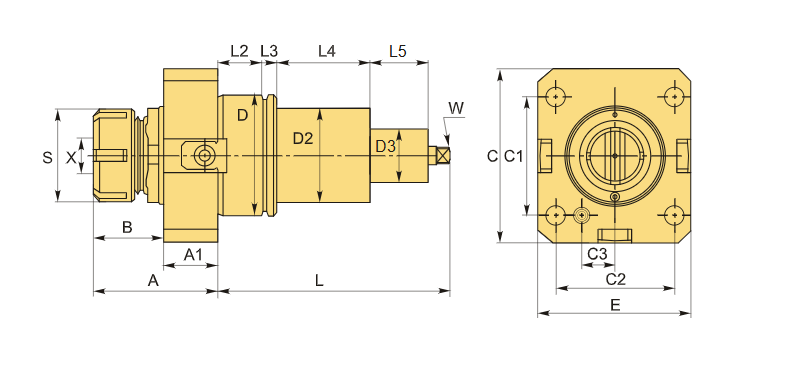 Для цанг ER32/ERS32 по стандарту DIN 6499. Зажим в диапазоне от 2 до 20 мм. Передаточное число – 1:1. Обеспечено внутреннее и внешнее охлаждение.