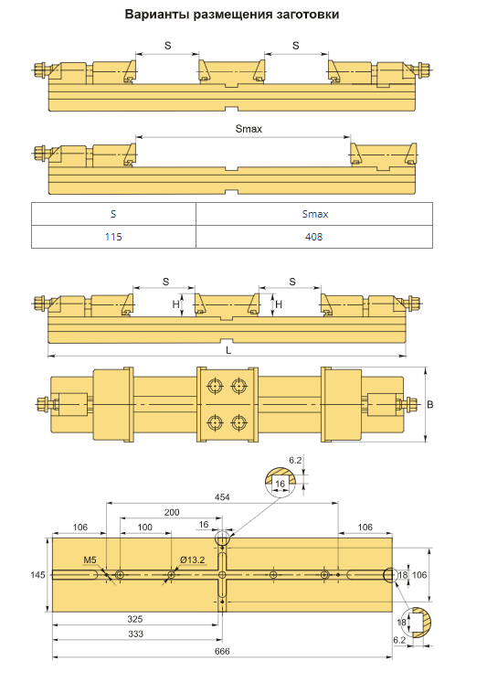 Станочные тиски ZQ83175-1 предназначены для одновременного зажима двух деталей разного размера. Центральный элемент может быть быстро снят при необходимости. Ширина подвижных губок тисков составляет 175 мм. Расстояние между губками S – 2×115 мм, максимальная ширина Smax при снятом центральном элементе составляет 408 мм.