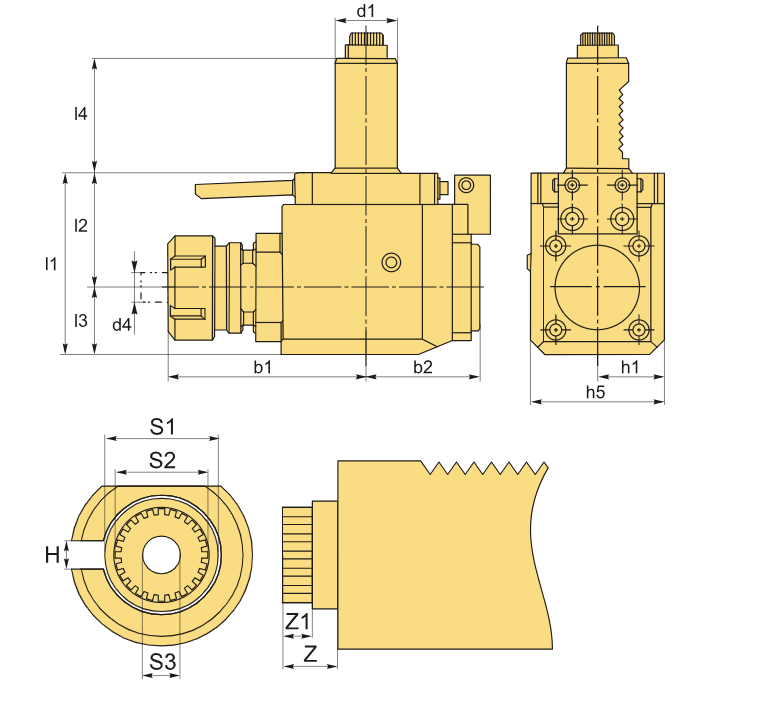 Радиальные (угловые) приводные блоки VDI предназначены для удержания инструмента и устанавливаются в револьверные головки токарных станков с числовым программным управлением и обрабатывающих центрах. Используется цанга ER25 по стандарту DIN 6499 с диапазоном зажима от 2 до 16 мм.